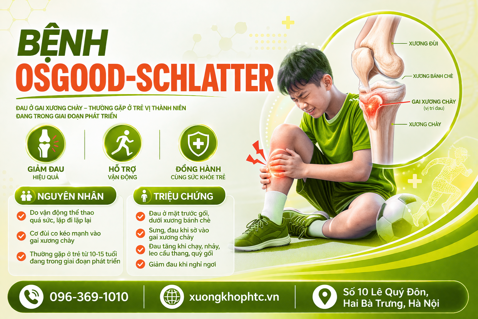 Bệnh Osgood-Schlatter là một tình trạng viêm tại điểm bám của gân bánh chè vào xương chày, thường gặp ở thanh thiếu niên trong giai đoạn phát triển nhanh. Bệnh Osgood-Schlatter gây đau vùng dưới xương bánh chè, đặc biệt khi vận động mạnh như chạy, nhảy hoặc đá bóng.