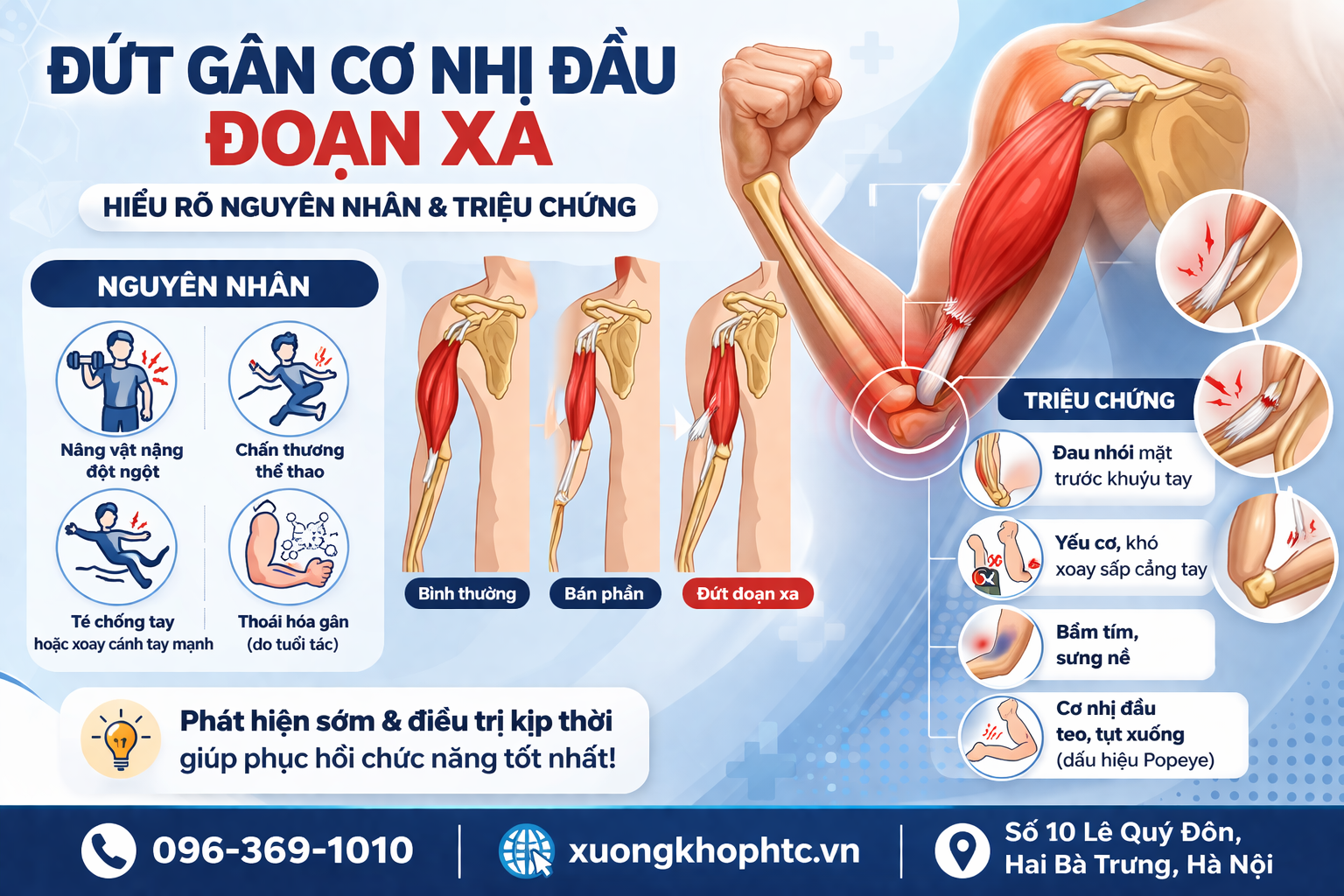 Đứt gân cơ nhị đầu đoạn xa là chấn thương gân tách khỏi xương quay tại khuỷu tay, thường gặp ở nam giới trung niên khi nâng vật nặng. Triệu chứng bao gồm tiếng “rắc” đột ngột, đau dữ dội, bầm tím, yếu cơ và biến dạng bắp tay. Phẫu thuật nối gân sớm (trong vòng 3 tuần) là cần thiết để khôi phục sức mạnh.