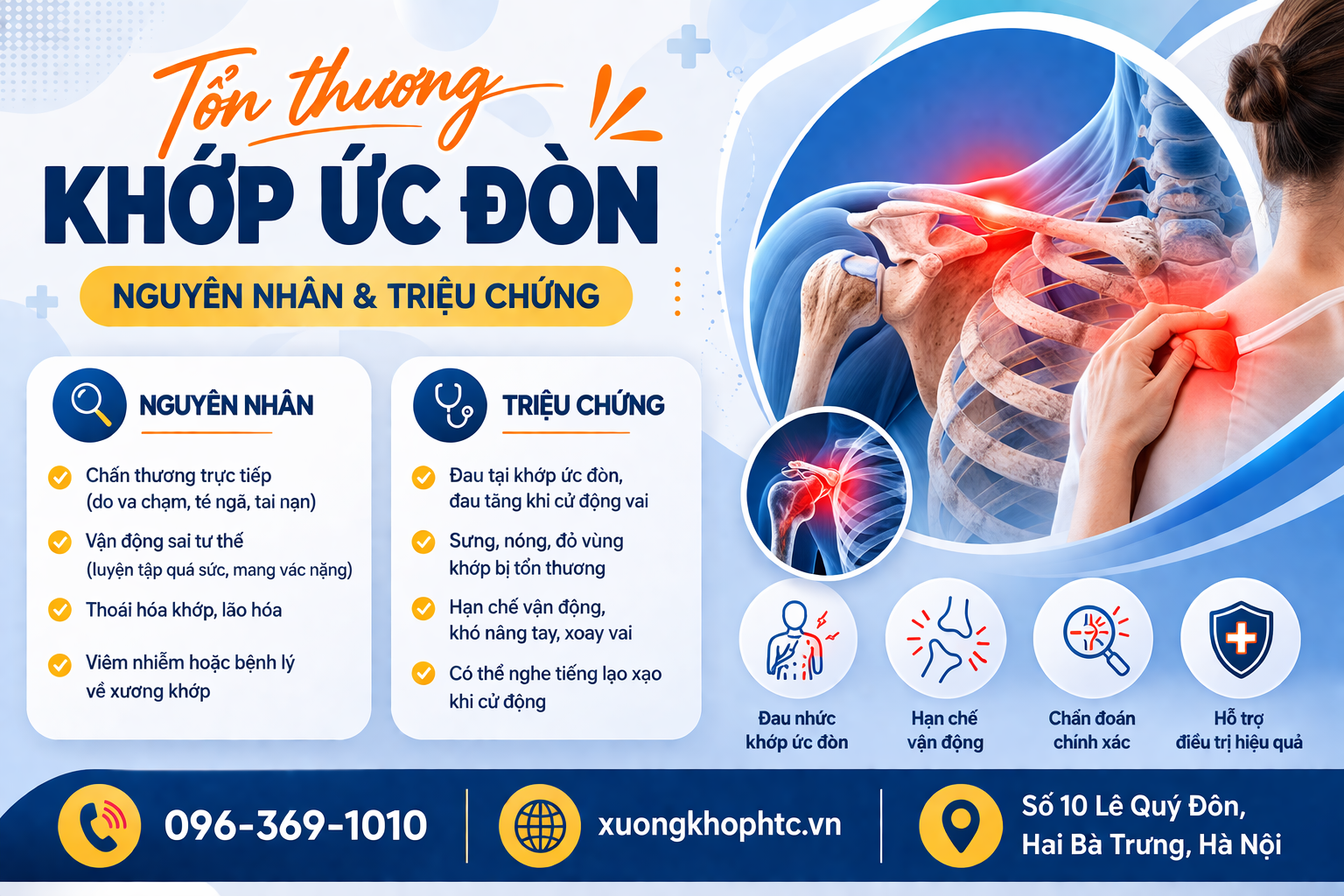 Tổn thương khớp ức đòn (SCJ) là tình trạng đau, viêm hoặc trật khớp nối giữa xương ức và xương đòn, thường do chấn thương (tai nạn, thể thao) gây đau, sưng, hạn chế vận động vai. Dạng tổn thương phổ biến là bong gân, trật khớp trước hoặc sau. Điều trị thường bảo tồn (nghỉ ngơi, chườm lạnh), nhưng trật khớp sau có thể cần can thiệp y tế khẩn cấp do nguy cơ chèn ép cơ quan lân cận.