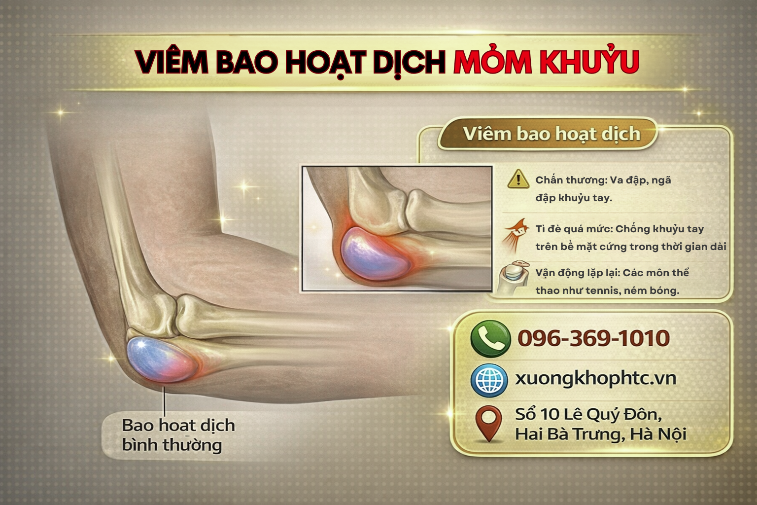 Viêm bao hoạt dịch mỏm khuỷu là tình trạng túi chứa dịch ở khuỷu tay bị sưng, viêm, tạo thành khối u “quả trứng ngỗng” phía sau khớp, thường do chấn thương, tì đè lâu ngày hoặc nhiễm trùng. Triệu chứng chính bao gồm sưng đỏ, đau khi vận động/ấn vào, nhưng đôi khi không đau. Điều trị chủ yếu là nghỉ ngơi, chườm đá, băng ép, thuốc kháng viêm, và hiếm khi cần phẫu thuật.