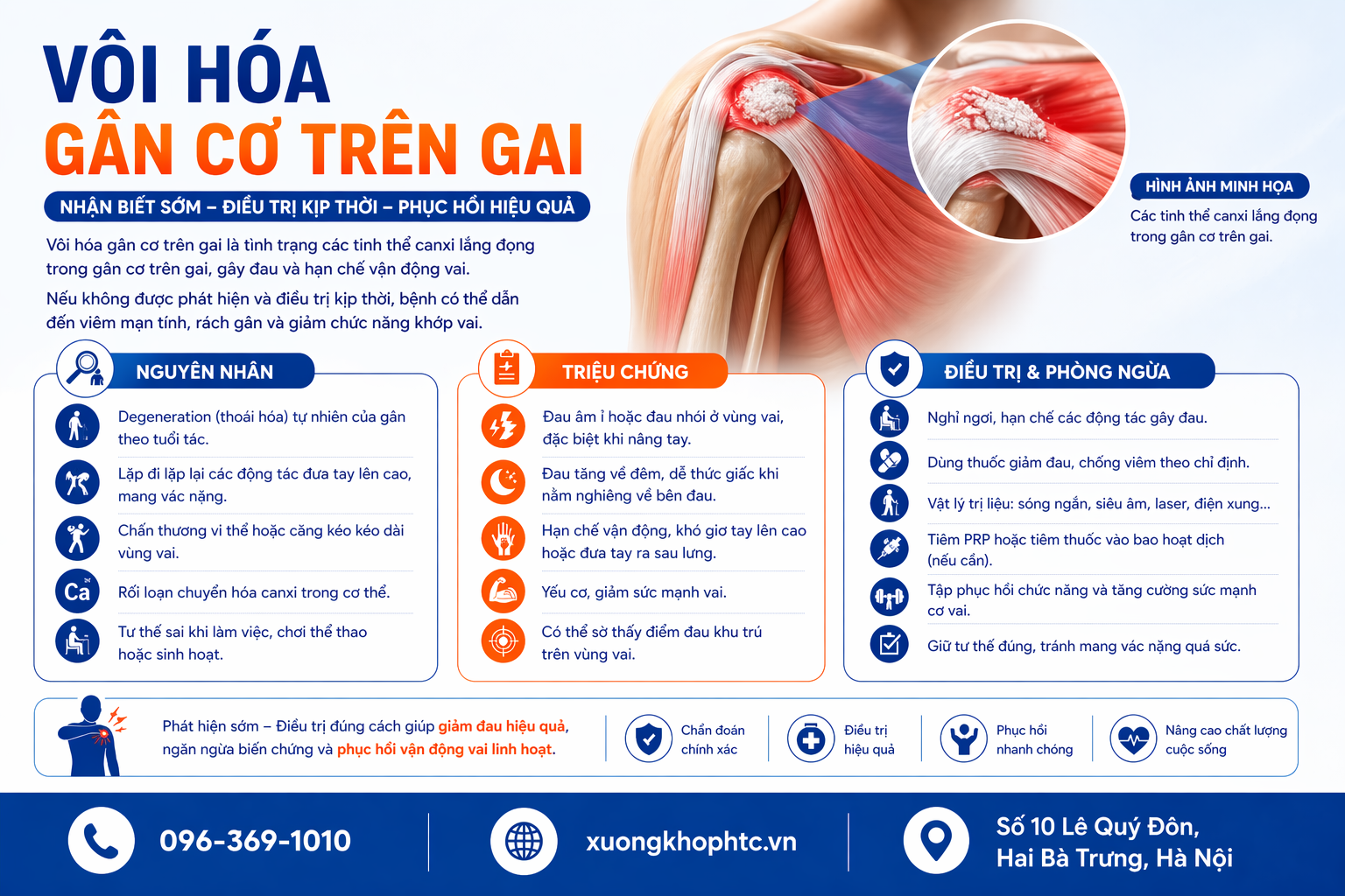Vôi hóa gân cơ trên gai (viêm gân vôi hóa) là tình trạng các tinh thể canxi (chủ yếu là hydroxyapatite) tích tụ bên trong mô gân của cơ trên gai. Đây là một trong những nguyên nhân phổ biến gây đau vai mãn tính hoặc đau dữ dội đột ngột.